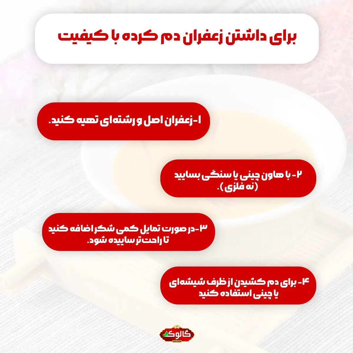 - ظرف مورد استفاده برای این کار بهتر است شیشه ای و یا چینی باشد؛ ظروف فلزی میتوانند رنگ زعفران را تغییر دهند.