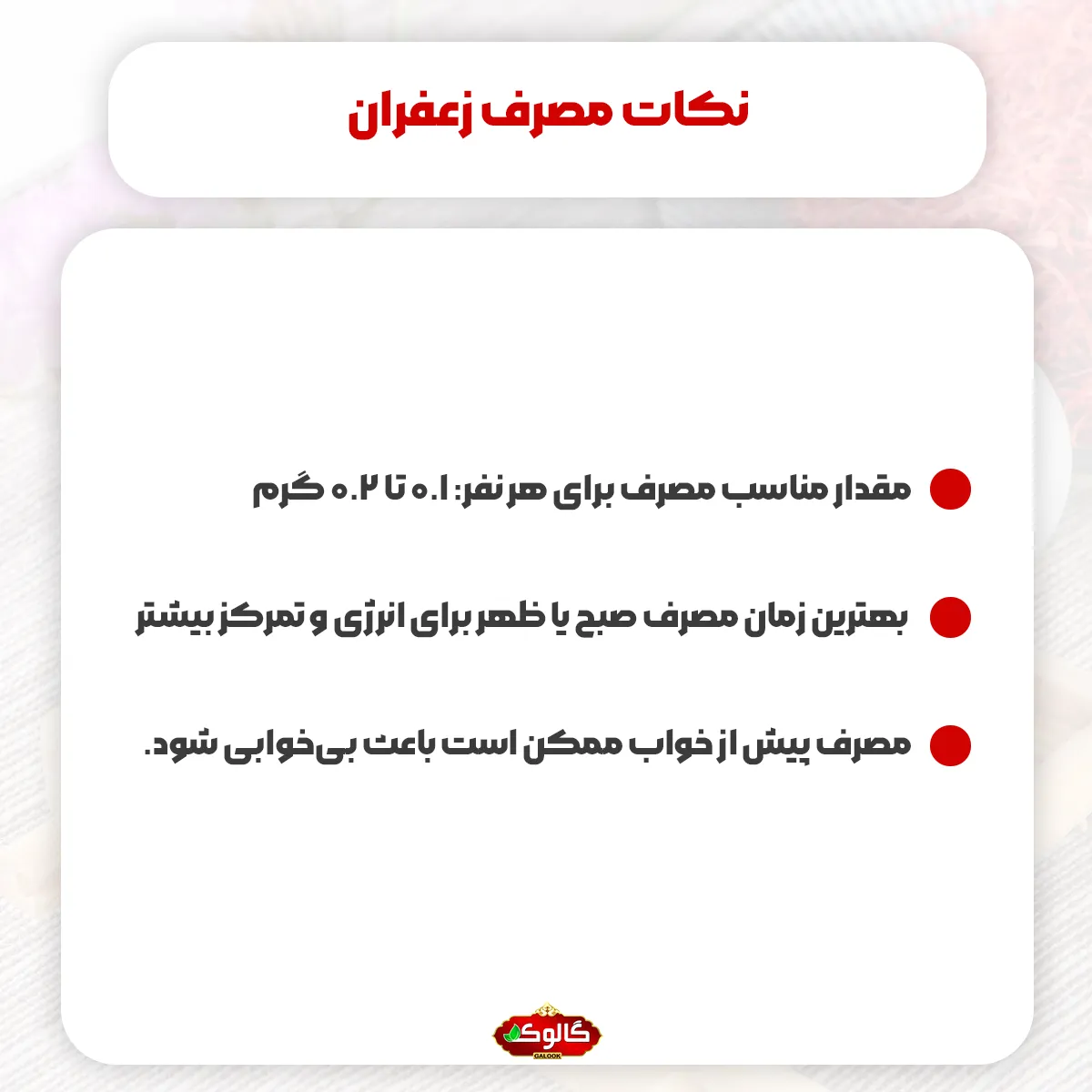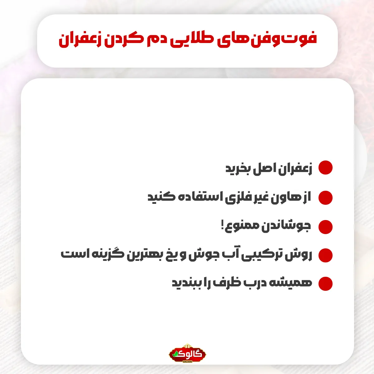 اگر بهدنبال زعفران درجهیک و ناب ایرانی هستید، میتوانید با ضمانت کیفیت و اصالت محصول، آن را از دسته بندی زعفران فروشگاه گالوک شاپ تهیه کنید.