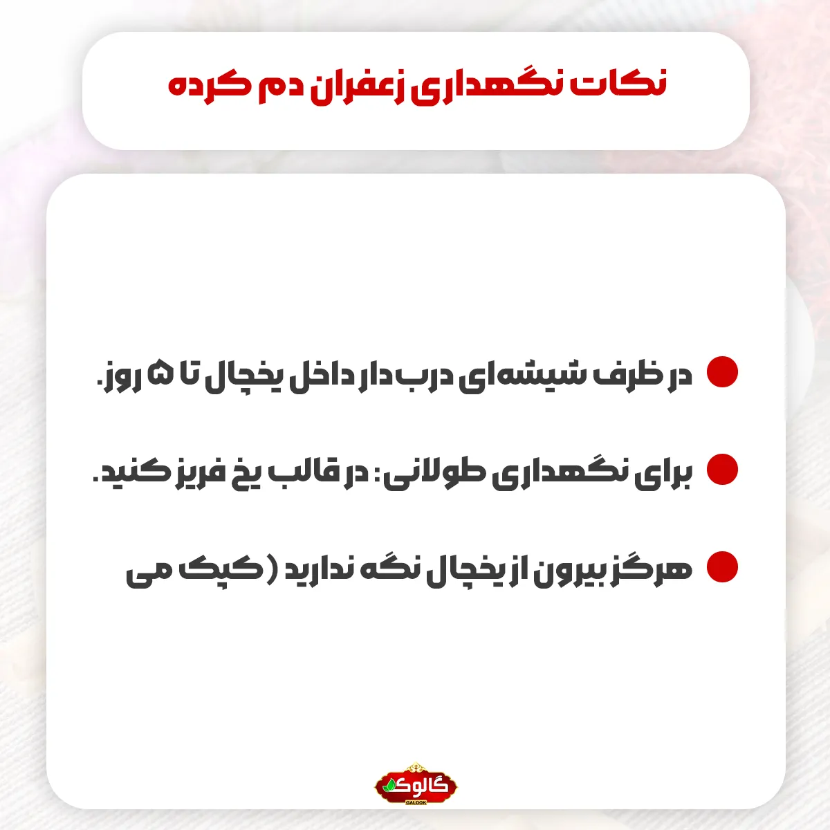- برای نگهداری دم کرده زعفران، باید از یک ظرف درب بسته داخل یخچال استفاده شود.