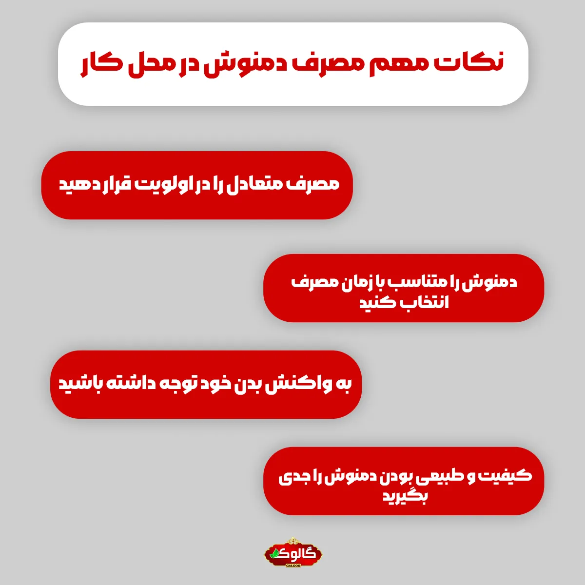 با رعایت این نکات، میتوانید بهراحتی از نوشیدنیهای گیاهی برای افزایش انرژی، تمرکز، آرامش و سلامت عمومی در طول روز کاری بهره ببرید و تجربهای لذتبخش و سالم از محیط کار خود داشته باشید. همچنین شما برای تهیه دمنوشهای طبیعی فاقد رنگ و اسانس میتوانید از دسته بندی دمنوش گالوکشاپ دیدن فرمایید.