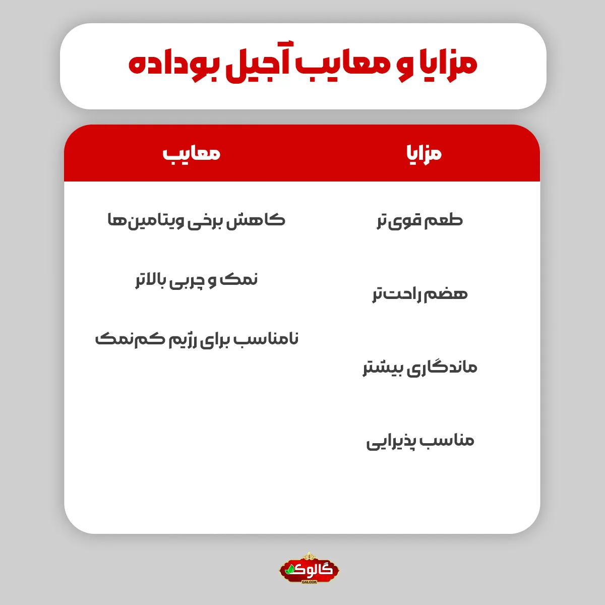 | ماندگاری | بهدلیل رطوبت طبیعی زودتر خراب میشود و نیاز به نگهداری مناسب دارد | ماندگاری بیشتر بهعلت خشک شدن در فرایند بوداده |