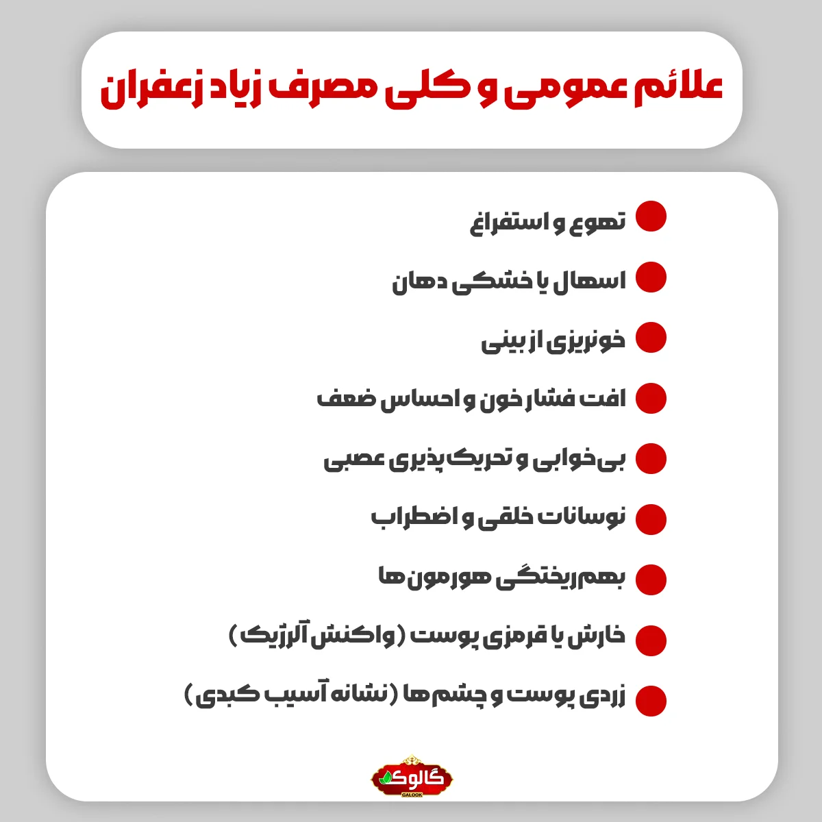 توجه داشته باشید که با مصرف متعادل زعفران، میتوانید از مزایای آن بهرهمند شوید و فقط در صورت زیادهروی، دچار عوارضی خواهی شد. همچنین تهیه زعفران اصل و با کیفیت، امر بسیار مهمی در جلوگیری از درگیری با عوارض مصرف زعفران است. شما میتوانید مقاله ۱۳ روش تشخیص زعفران اصل از تقلبی گالوک را مطالعه کنید تا انتخابی آگاهانه داشته باشید.