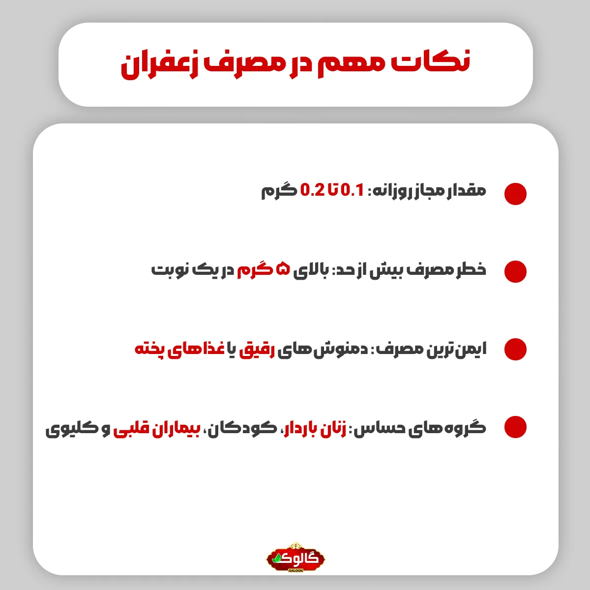 ما در گالوک برای شما زعفران با کیفیت و درجه یک را با قیمت رقابتی فراهم کردهایم تا هم از فواید طلای سرخ بهرهمند شوید و هم از بروز عوارض مصرف زیاد زعفران پیشگیری کنید. با خرید زعفران اصل و مصرف متعادل، میتوانید این ادویه گرانبها را ایمن و لذتبخش استفاده کنید.