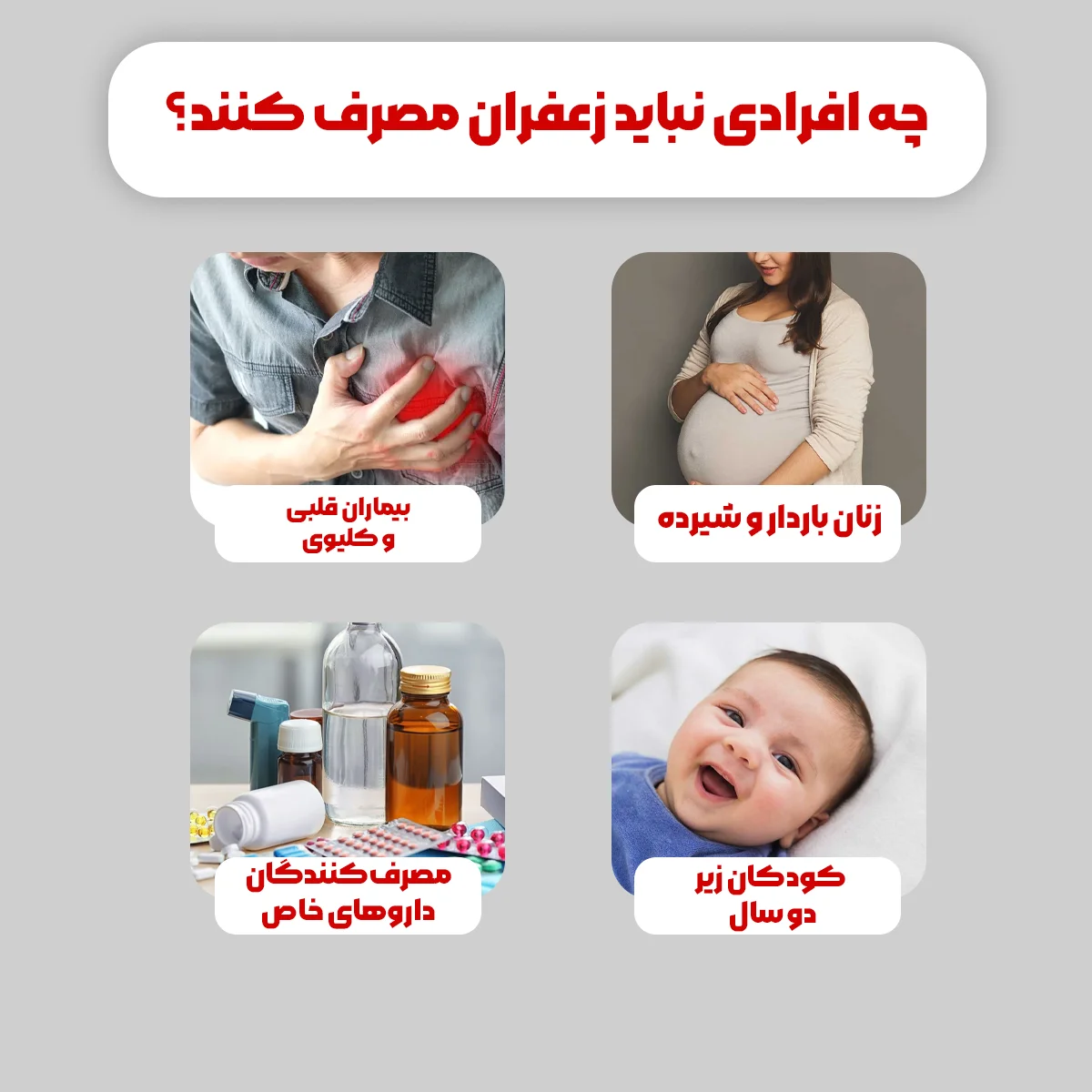 - کودکان زیر دو سال: سیستم گوارشی و ایمنی کودکان زیر دو سال به طور کامل تکامل نیافته است و مصرف زعفران در این سنین ممکن است منجر به واکنشهای آلرژیک یا مسمومیت شود.