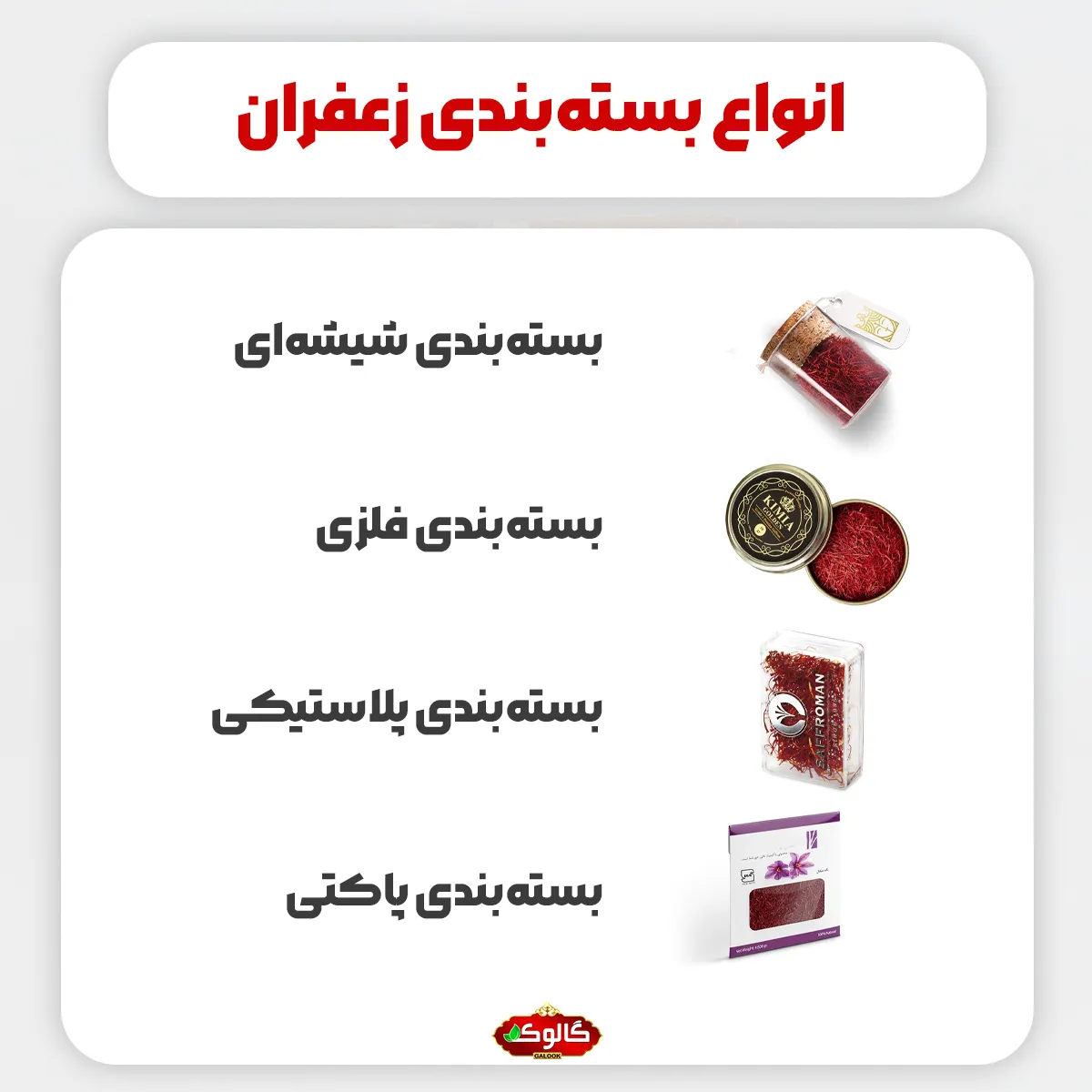 انواع بسته‌بندی زعفران: بسته‌بندی شیشه‌ای بسته‌بندی فلزی بسته‌بندی پلاستیکی بسته‌بندی پاکتی