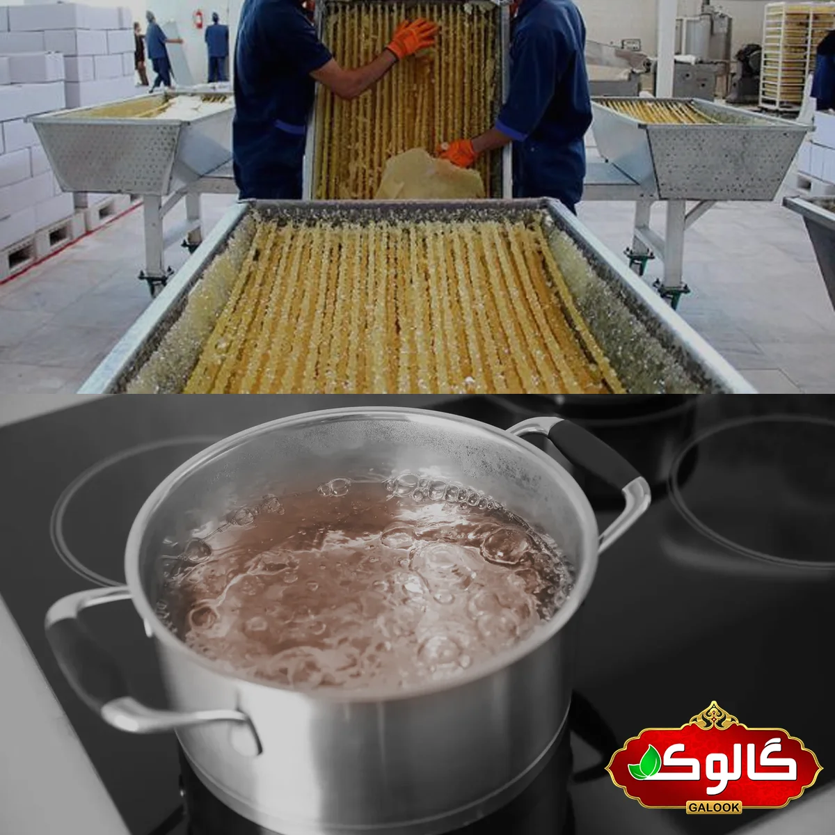 - افزودن طعم و رنگ: در دمای حدود ۱۱۰ درجه سانتیگراد میتوان زعفران یا دیگر طعمدهندهها را به محلول اضافه کرد.
