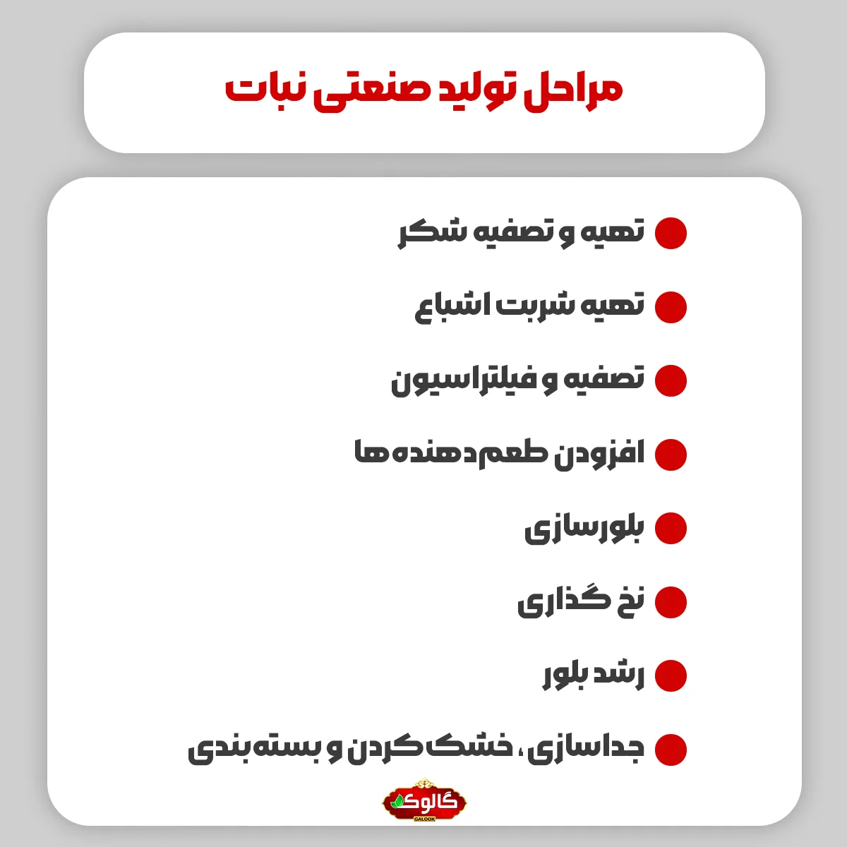 نبات صنعتی | بلور یکنواخت و تولید انبوه | روش صنعتی تمام اتوماتیک | توزیع گسترده، بستهبندی استاندارد | کنترل دقیق شرایط، یکنواختی رنگ و کیفیت مهم است |