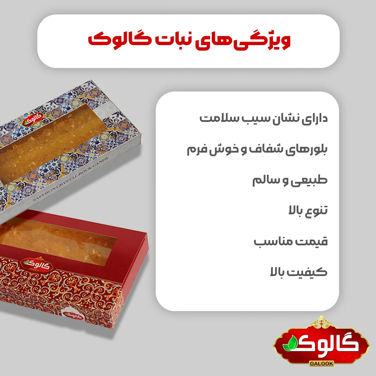 ویژگی‌های نبات گالوک که شامل: دارای نشان سیب سلامت-طبیعی و سالم-بلورهای شفاف و خوش فرم-بسته بندی زیبا و کاربردی-تنوع بالا- قیمت مناسب و کیفیت بالا می‌شود.